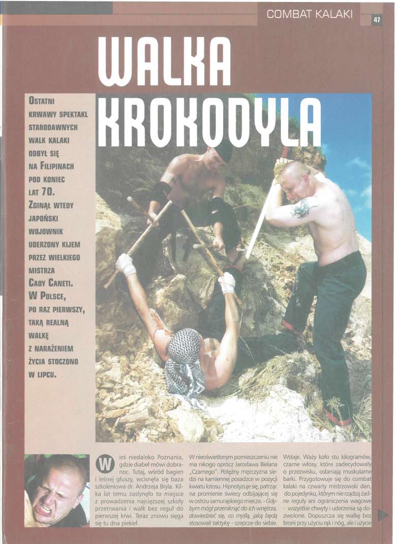 -Gdybym mógł przeniknąć do ich wnętrza, dowiedzieć się, co myślą, jaką będą stosowali taktykę - szepcze do siebie. Wstaje. Waży koło stu kilogramów, czarne włosy, które zadecydowały o przydomku, osłaniają muskularne barki. Przygotowuje się do combat kalaki, na czwarty mistrzowski dan, do pojedynku, którym nie rządzą żadne reguły ani ograniczenia wagowe - wszystkie chwyty i uderzenia są dozwolone. Dopuszcza się walkę bez broni przy użyciu rąk i nóg, ale i użycie specjalnych bambusowych kijów. Na porządku dziennym jest też ucisk na gałki oczne, duszenie, gryzienie, kopnięcie w najczulsze miejsce, łamanie żeber czy “kasowanie” stawu kolanowego. Pojedynek będzie trwał do fizycznej eliminacji jednej ze stron. Zawodnik musi liczyć tylko na siebie. Nikt mu nie pomoże ani nie powstrzyma rozjuszonego przeciwnika. Może za to zapłacić życiem. Ale “Czarny” już podjął decyzję. Lekarz z samochodem wypełnionym po brzegi sprzętem medycznym na wszelki wypadek będzie czekał w pobliżu. Najpierw jednak, w opuszczonej żwirowni, w specjalnej zbroi, przejdzie testy sytuacyjne. Dla “rozgrzewki” zmierzy się z kilkoma przeciwnikami naraz. Będzie też musiał w pełnym rynsztunku poddać się próbie odwagi i skoczyć z wysokiej skarpy, co ze względu na znaczny ciężar kasku, szczelnie przylegającego do czaszki, może zakończyć się skręceniem karku. Dopiero potem rozpocznie się prawdziwe starcie, walka w bezpośrednim kontakcie, jeden na jednego. Wtedy trzeba będzie za wszelką cenę unieruchomić przeciwnika, walczyć nawet w sytuacji, gdy tryska krew i pękają kości. O przerwaniu pojedynku decyduje tylko jeden sędzia - Bryl. “Czarny” jest instruktorem bojowego systemu walki BAS-3 w Centrum Szkolenia Specjalnego we Wrocławiu. W wolnych chwilach dorabia jako wykidajło w ekskluzywnym klubie nocnym. Nieraz mu przyszło ostro interweniować. Jakiś czas temu “napoczął” faceta ze światka przestępczego. Okazało się, że była to ważna figura. Mafia wydała na “Czarnego” wyrok śmierci. Z zaczesanymi do tyłu włosami i kitką sięgającą ramion na pierwszy rzut oka wygląda na dobrotliwego dżina wypuszczonego z butelki. Lecz to mylne wrażenie, jego włosy potrafią utrzymać ciężar ciała. Jarosław ćwiczy na nich zwisanie z drążka. Kiedy przeciwnik szarpnie bujną czuprynę, myśląc, że w ten sposób zapewni sobie przewagę, czeka go niemiłe rozczarowanie - ból wyrywanych włosów wyzwala dziką agresję, niesamowicie nakręca “Czarnego”. Wtedy biada śmiałkowi. ZA PLECAMI ROTTWAILERA Terenu na którym odbędą się walki, strzegą rottweilery i ochroniarze z krótkofalówkami. Widzami mogą być tylko uczestnicy właśnie odbywającego się tu szkolenia bojowego systemu walki BAS-3. Tak zadecydował dr Andrzej Bryl, szef “Delta Security”, organizator przedsięwzięcia. Jednak nawet im skonfiskowano aparaty fotograficzne i kamery video. Dziwna to walka. Nie toczy się o forsę ani dla zabawienia rozwydrzonego tłumu. Zawodnicy nie dostaną nawet medalu. Po prostu pragną sprawdzić wytrzymałość swojego organizmu. Zwłaszcza “Czarny” chce pobić wszystkie rekordy. Robi to wbrew zdrowemu rozsądkowi. Do takiej walki przygotowywał się przez dziesięć lat. Na czas boju musiał nauczyć się przesuwać barierę bólu, lęku i zahamowań.Co ważne, nie można było pozwolić na udział w walce komuś, kto nie umie “wyłączyć” instynktu samozachowawczego. To osłabia wolę zwycięstwa.